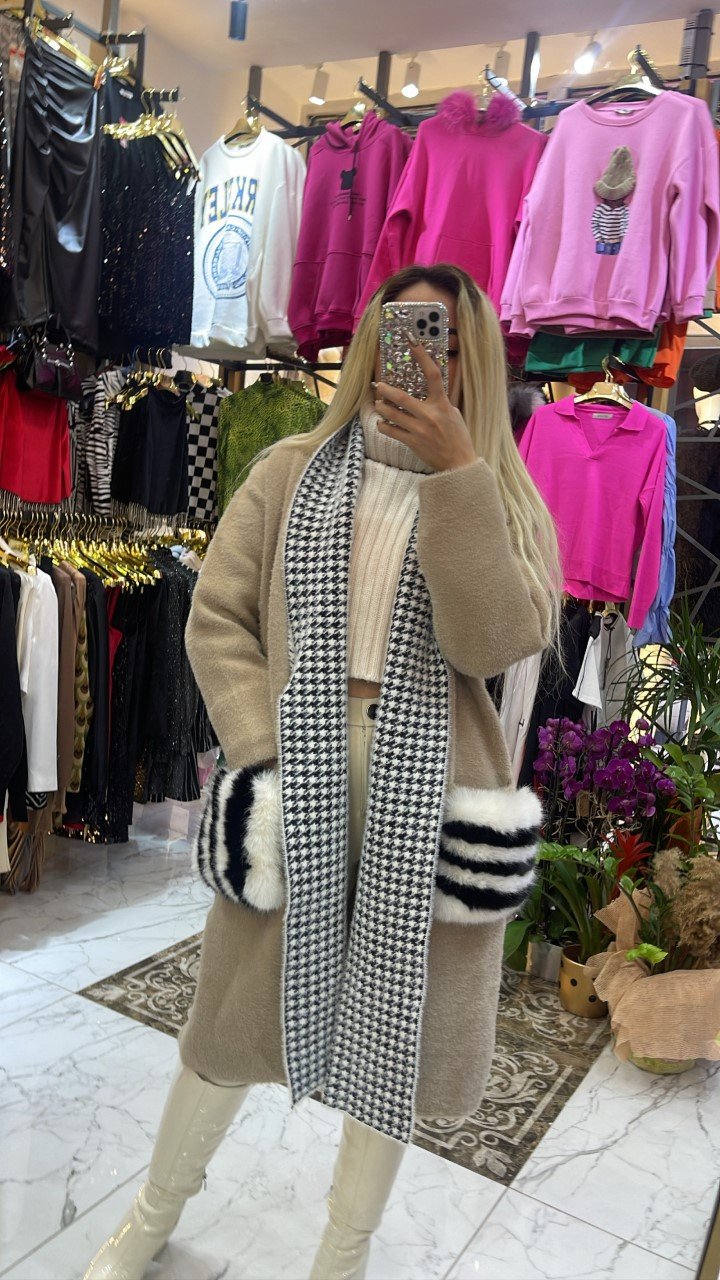 Bej Pötikare Detaylı Angora Kürk